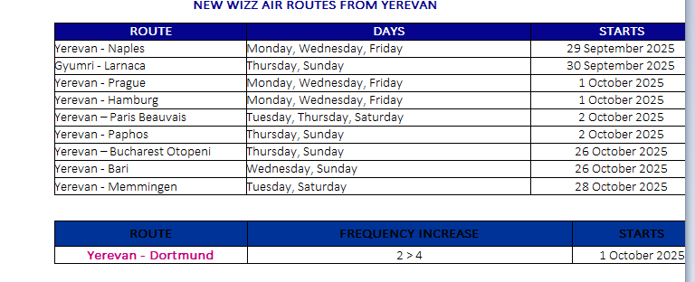 Two modern Airbus A321neo aircraft will be stationed at Yerevan starting from today and will allow Wizz Air to introduce eight new direct routes to Europe for Armenians: Prague, Hamburg, Paphos, Paris, Naples, Bari, Bucharest, and Memmingen. The airline will also increase frequency on the Dortmund route to four flights per week. Additionally, starting from September 30, 2025, Wizz Air has also launched direct flights from Gyumri’s Shirak Airport to Larnaca, Republic of Cyprus. In total, the airline plan to carry more than 1.2 million passengers to and from Yerevan this year. Ticket prices start from as low as 9000 AMD and are available for purchase both on our official website and through the mobile app.