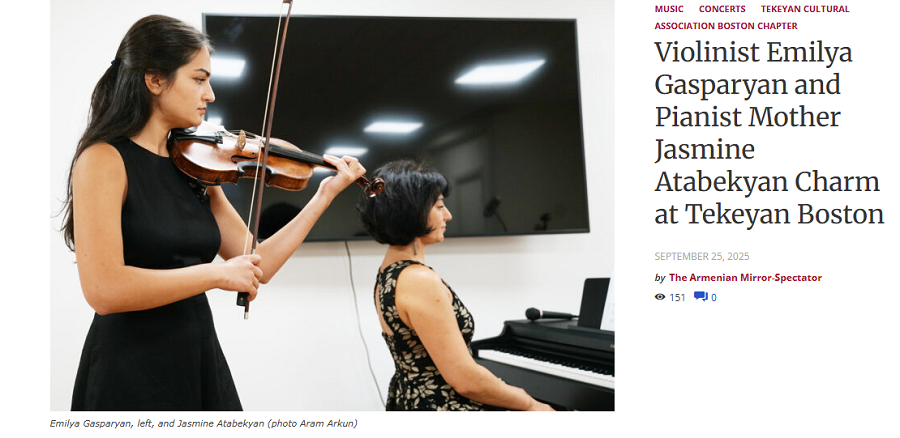 WATERTOWN — Mother-daughter duo violinist Emilya Gasparyan and pianist Jasmine Atabekyan charmed a Sunday late afternoon audience on September 21 at the Baikar Building in Watertown with a concert of classical music. The event was hosted by the Tekeyan Cultural Association (TCA) Boston Chapter.
