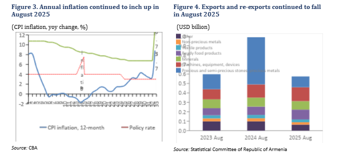 In September, inflation rose to 3.7 percent (yoy), slightly up from 3.6 percent in August (Figure 3). The major contributors to this increase were food and non-alcoholic beverages with 5.8 percent (yoy) inflation. Accounting for a combined 18 percent share in the consumption basket, inflation in health (3.5 percent) and transport (4.1 percent) also contributed to the rise in September’s headline inflation. On September 16, Armenia’s Central Bank (CBA) decided to keep the policy rate at 6.75 percent, while signaling a gradually easing cycle, with plans to reduce the refinancing rate to around 6.25 percent over the next 12 months.