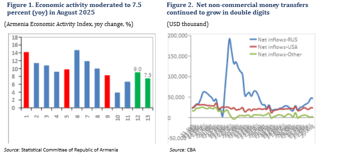 In September, the AMD/USD exchange rate remained stable mom, appreciating 1.2 percent in yoy terms. However, the AMD depreciated against the EUR (4.4 percent, yoy) and the RUB (9 percent, yoy). In August, the Real Effective Exchange Rate (REER) depreciated 2.2 percent (yoy). Gross reserves grew to USD 4.2 billion, equivalent to 4 months of import cover. In H1 2025, net foreign direct investment (FDI) inflows rose to 0.6 percent of annual GDP, mainly in mining and aviation, following 2024’s historical low of 0.3 percent of GDP.