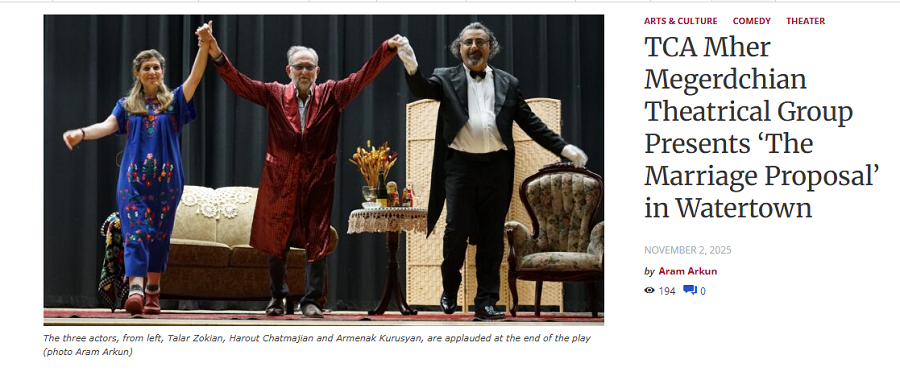 WATERTOWN — The Tekeyan Cultural Association (TCA) Mher Megerdchian Theatrical Group of New Jersey presented a Western Armenian dinner theater version of Anton Chekhov’s “The Marriage Proposal” in Watertown, on Sunday, October 26. The event was cosponsored by St. James Armenian Church, the Society of Istanbul Armenians of Boston and the Tekeyan Cultural Association Boston Chapter and took place at St. James Church’s Keljik Hall, which was filled to capacity.