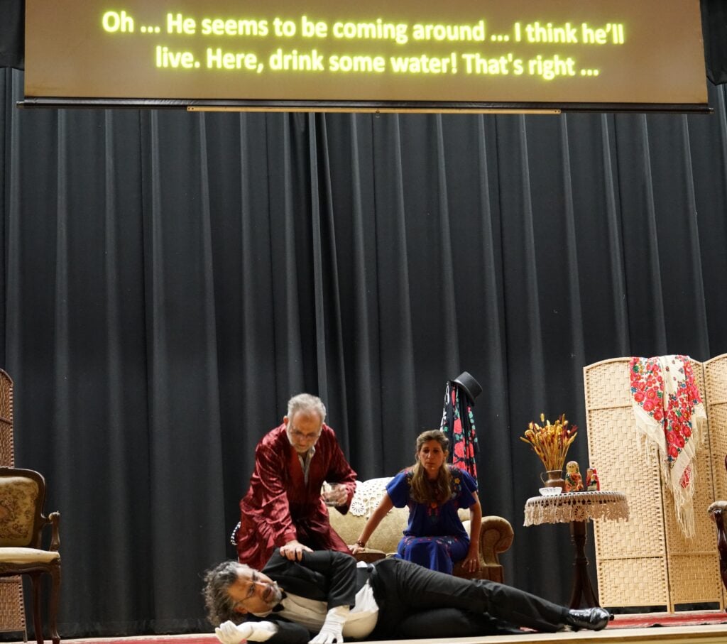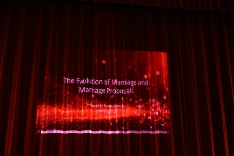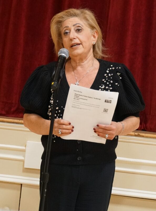 TCA Boston Chapter Recording Secretary Maral Der Torossian welcomed guests in Armenian and English and provided some background information about the play and the Mher Megerdchian Theatrical Group. The actual play was preceded by a comic “historical introduction” to the history of marriage proposals by “Professor” Harout Chatmajian, accompanied by slides, while guests enjoyed a sumptuous dinner. The dialogue was in Armenian, with English subtitles projected onto a screen.