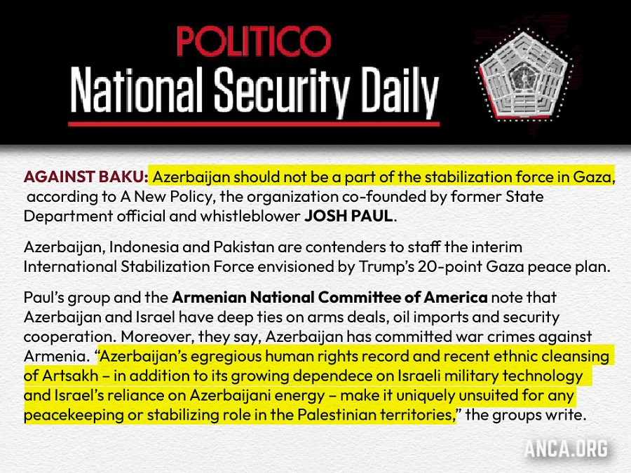 WASHINGTON, DC – A New Policy and the Armenian National Committee of America (ANCA) and have rallied a coalition of 18 U.S. organizations to oppose the potential inclusion of Azerbaijan in the International Security Force (ISF) planned for Gaza under President Trump’s 20-Point Plan. The coalition released a statement urging the United States and international partners to reject any Azerbaijani military presence in the force, citing its ethnic cleansing of Artsakh’s Armenian population in 2023 and deep military partnership with Israel as disqualifying factors.