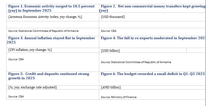 In October, inflation stabilized at 3.7 percent (yoy) (Figure 3). Inflation in food and non-alcoholic beverages (at 5.6 percent, yoy) remained the main contributor to October’s inflation (61 percent of the total increase). On November 4, Armenia’s Central Bank (CBA) decided to maintain the policy rate at 6.75 percent, marking the sixth consecutive meeting without a change to the rate.