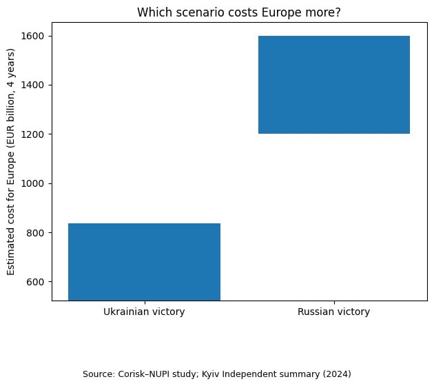 Scenario 2 – Ukrainian victory: Europe arms Ukraine (1,500-2,500 tanks, 2,000-3,000 artillery systems, up to 8 million drones, modern air defence), enabling it to push back Russian forces and force the Kremlin into a favourable peace. Researchers estimate the cost at €522–838 billion over four years – roughly half of what Europe would pay in the event of a Russian victory.