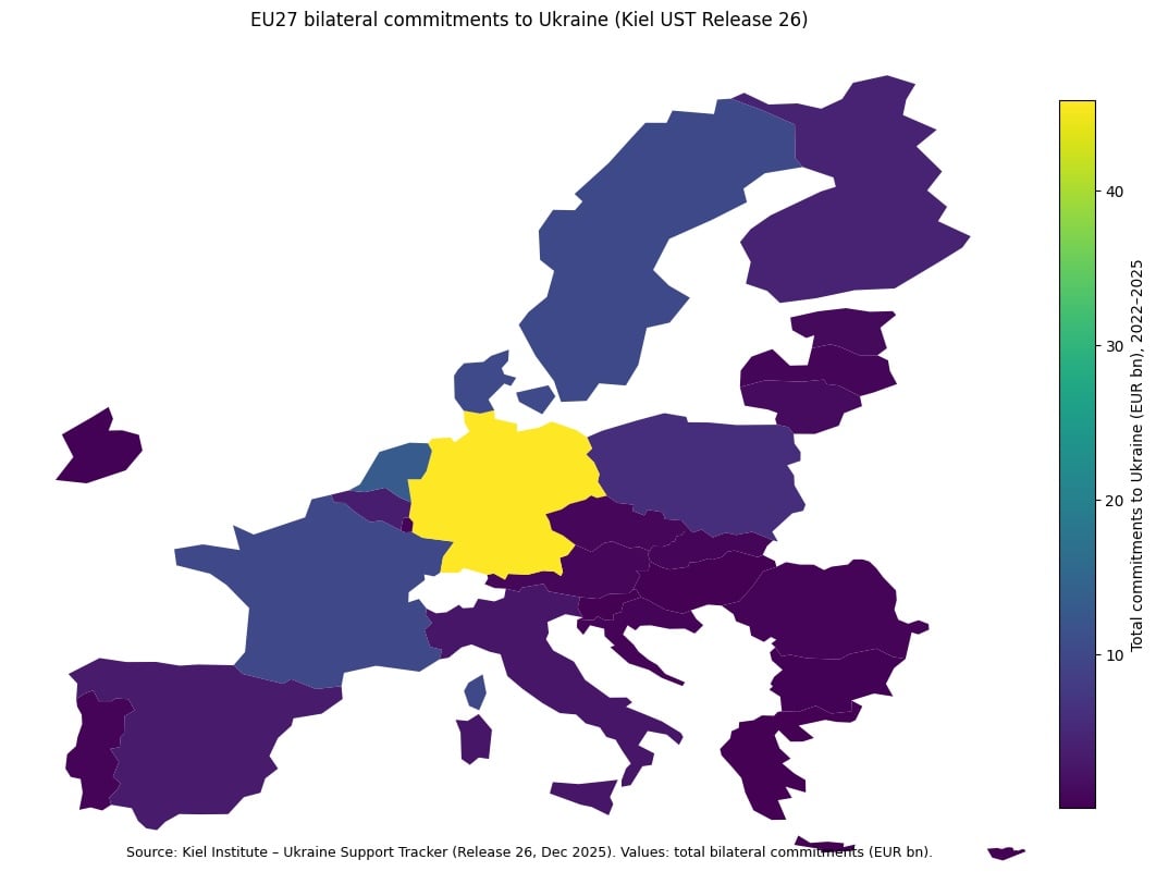 Amid the transatlantic “who pays more?” debate, latest data shows that earlier this year Europe moved from being a passenger to becoming the main financier. According to the Kiel Institute, since 2022 EU institutions and member states together have committed around €165.7 billion in support to Ukraine, while the United States has provided about €130.6 billion.