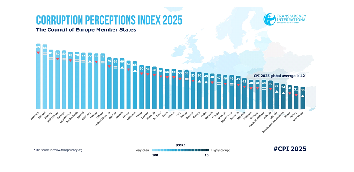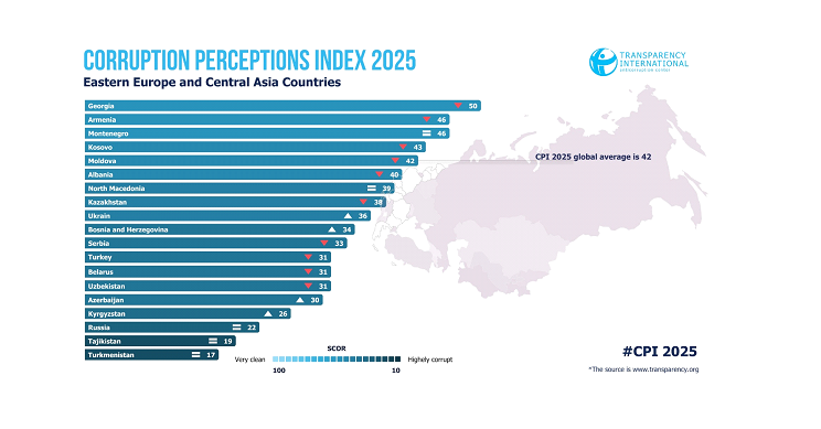 Armenia’s CPI 2025 score decreased by one point compared to the previous year, falling to 46 points on a scale from 0 (highly corrupt) to 100 (very clean). In the CPI ranking covering 182 countries in 2025, Armenia shares 65th–69th places with Kuwait, Montenegro, Namibia, and Senegal (in 2024, Armenia shared 63rd–64th places among 180 countries).