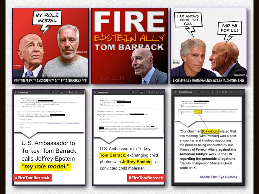 WASHINGTON, DC – The Armenian National Committee of America (ANCA) is calling on President Trump to immediately fire U.S. Ambassador to Turkey Tom Barrack – an unapologetic denier of the Armenian Genocide – following revelations in the Department of Justice’s Epstein Files documenting his decade-long friendship with convicted sex trafficker Jeffrey Epstein.