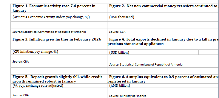 In January, an overall budget surplus equivalent to 0.9 percent of estimated annual GDP was recorded, consistent with patterns seen in previous Januarys. In January, total revenues and grants grew 7.5 percent (yoy) in nominal terms. Tax revenues (including mortgage-related income tax) increased by 7.8 percent (yoy), mostly driven by a 19 percent (yoy) rise in income tax collections and a 6.8 percent increase in VAT collection. Total expenditure grew 9.3 percent (yoy), driven by the 21.2 percent (yoy) current expenditure increase, while capital expenditures shrunk by 67.3 percent (yoy), reflecting a 64.8 percent (yoy) decline in capital defense spending from a high base in 2025. Current health spending almost tripled in January (yoy), due to the introduction of public health insurance.