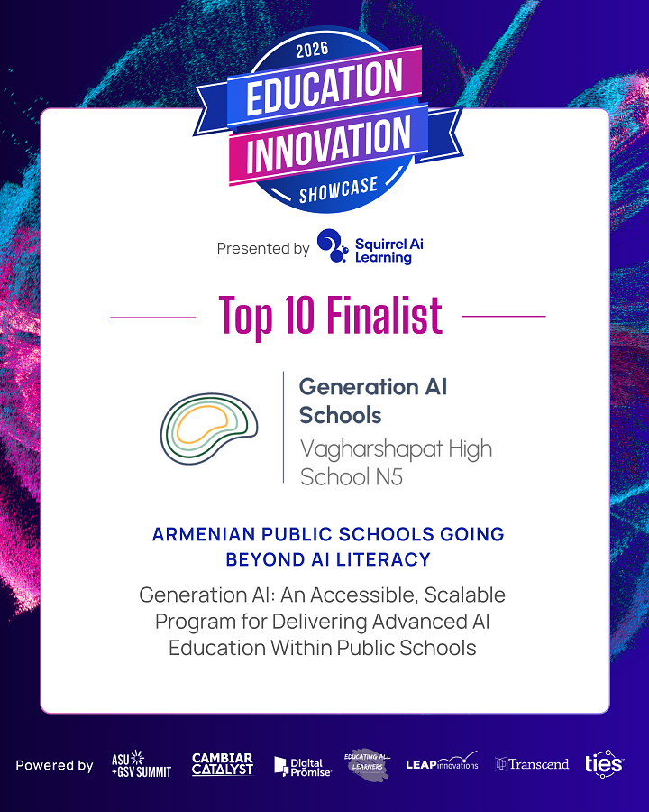 Represented by Vagharshapat High School N5, the program’s nationwide school network placed in the Top 5 of the Impact category at one of the world’s most influential platforms at the intersection of education, technology, and impact.